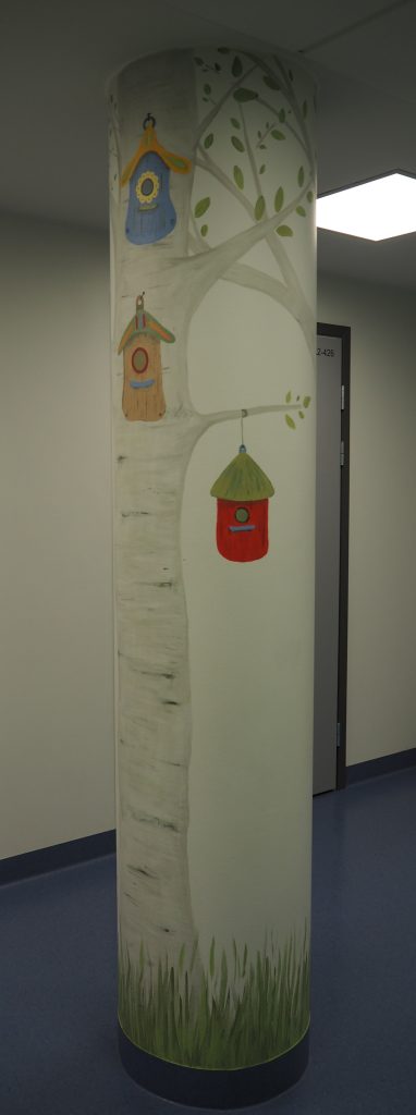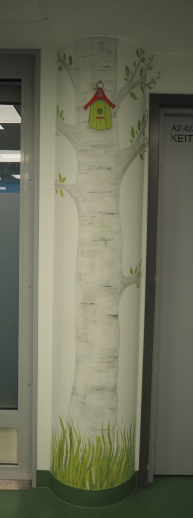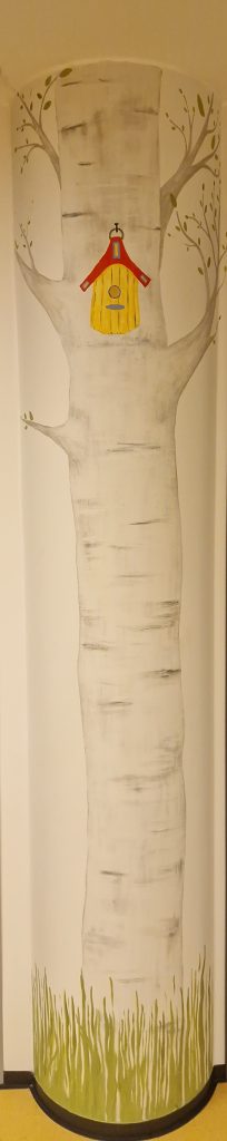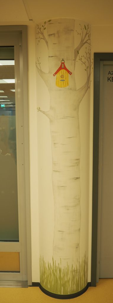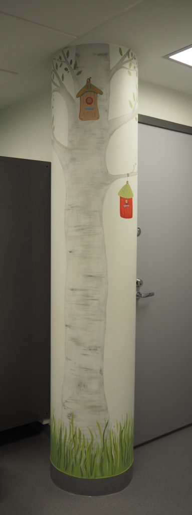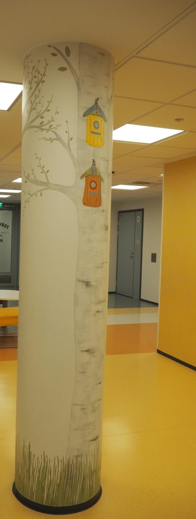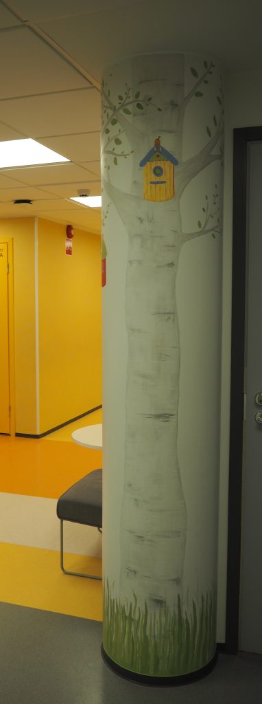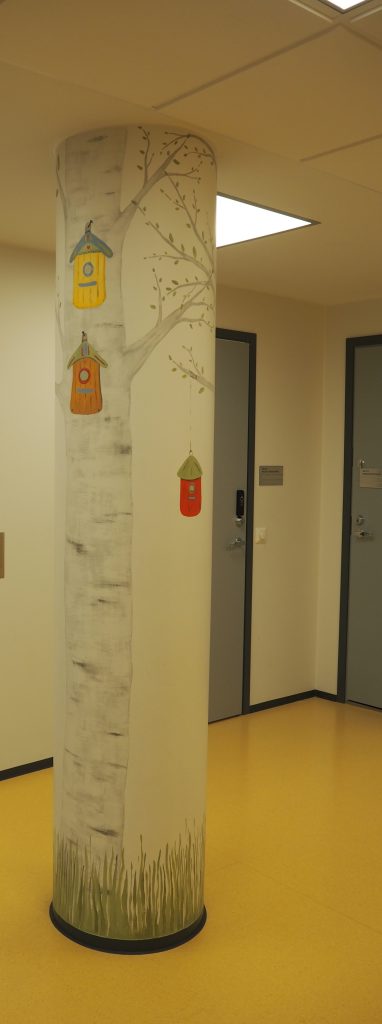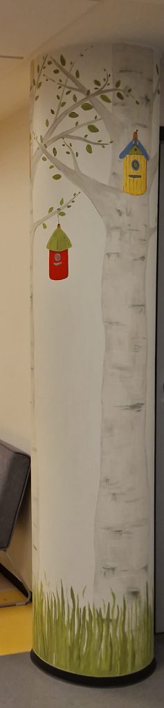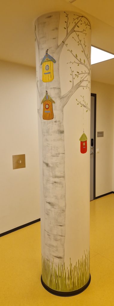 18.2.-7.6.2025 Koivu/linnunpönttö-aiheiset seinämaalaukset, kahdelle eri osastolle käytävien pylväisiin, yhteensä kuuteen pylvääseen koivuja tuli yhdeksän, joissa oli eri kokoisia värikkäitä linnunpönttöjä. Yhdelle osastolle tuli värikäs tunnepuu huoneen seinälle.